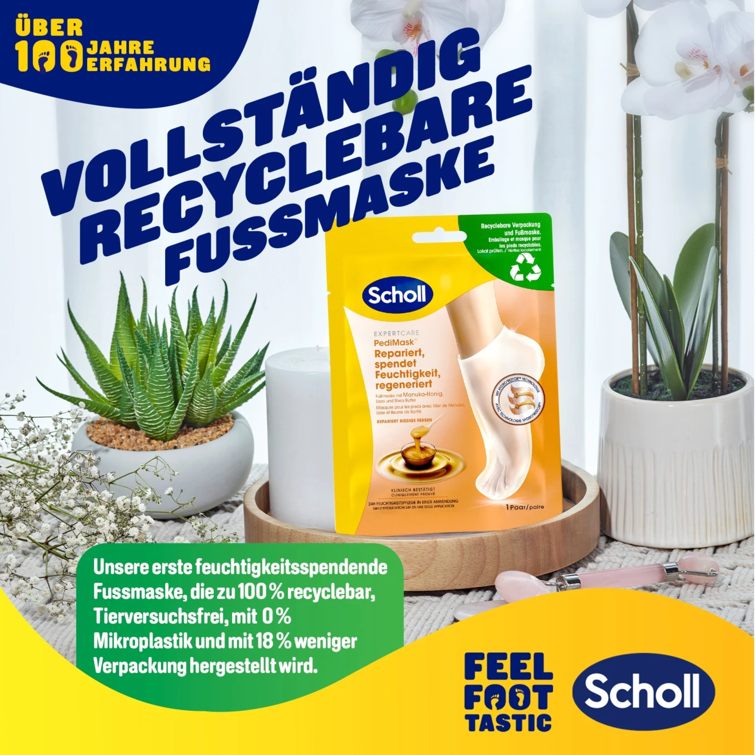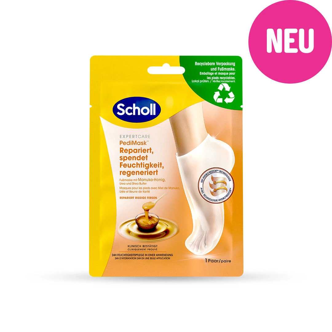 24 STUNDEN FEUCHITGKEIT: Scholl’s ExpertCare Fussmaske mit Manuka-Honig für trockene Haut mit Sheabutter ist darauf ausgelegt, Deine Füsse intensiv mit Feuchtigkeit zu versorgen.