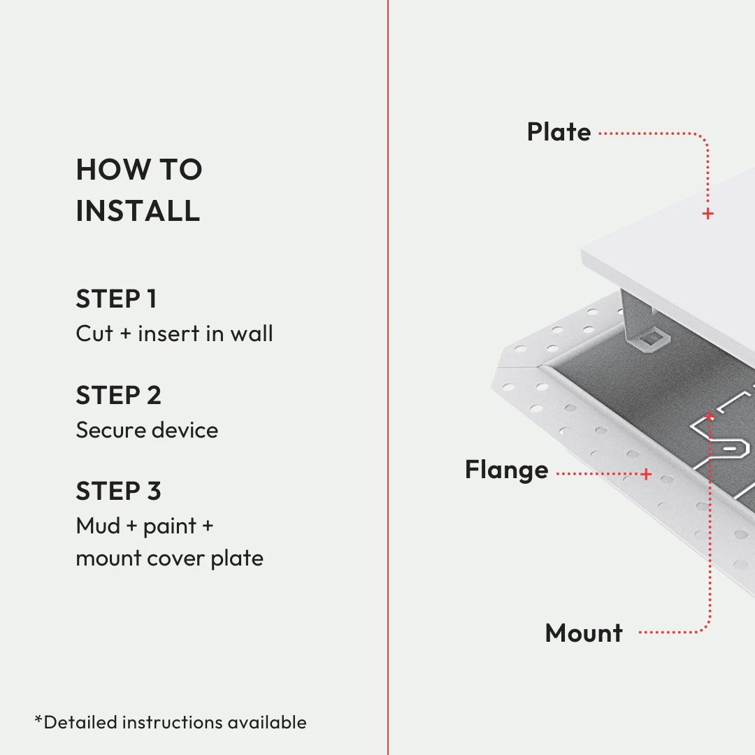 This model can be used in two ways: mount a device with the included cover plate for a clean finish, or leave the cover plate off.