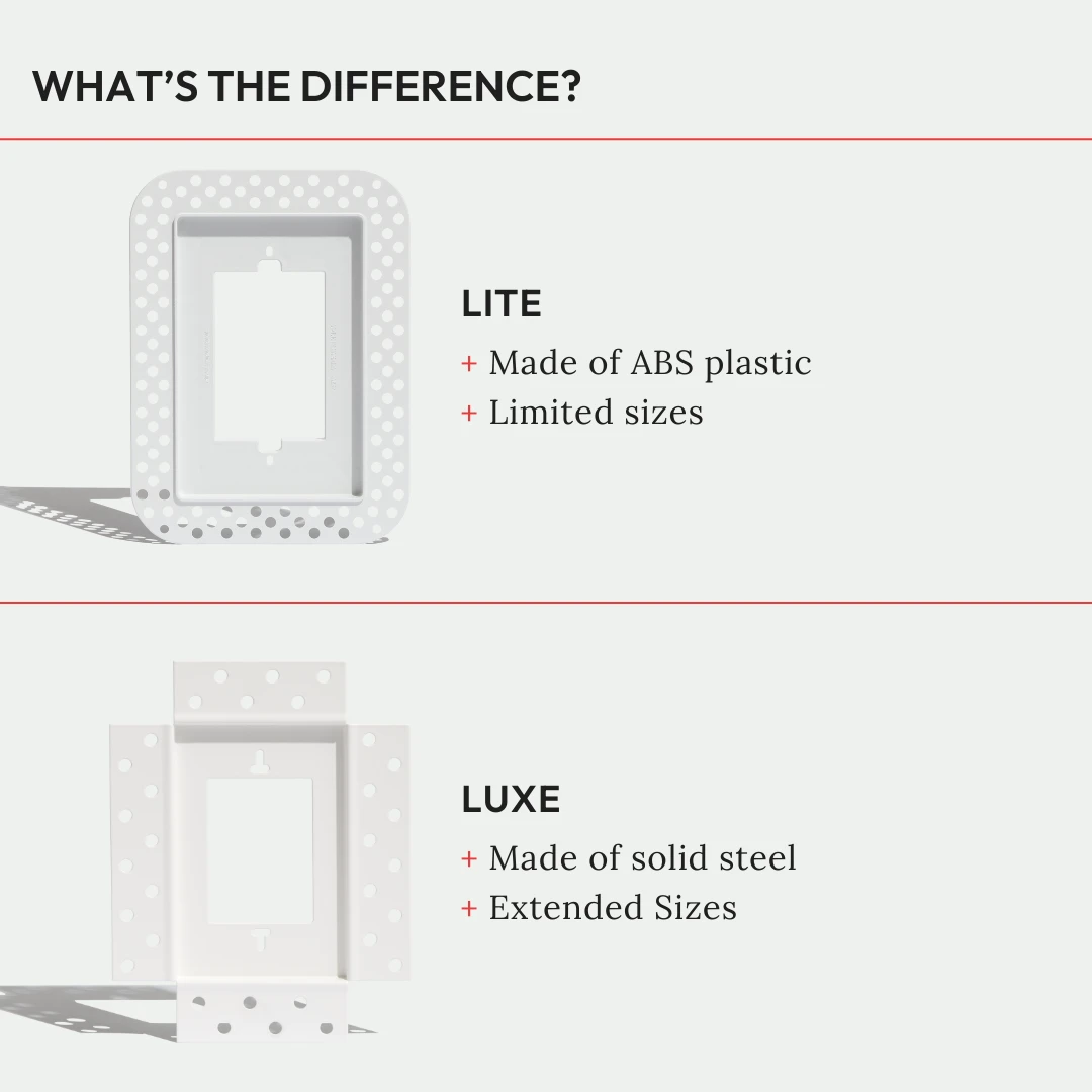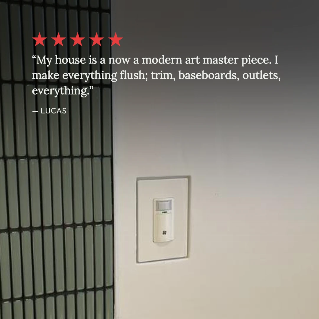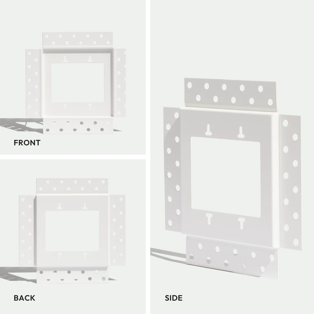 Ultra-minimalist device mount for a seamless design that recesses light switches, outlets, Ethernet and phone receptacles, and more. Customizable powder-coated steel panel with a flush finish blends right into the wall. Pro install in 30 minutes. Requires drywall mudding.