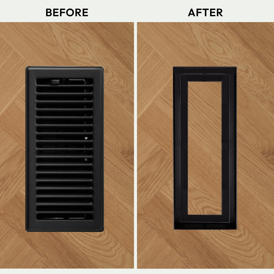 We’ve reimagined old-fashioned grill vents. An ultra-minimalist design with all the features of the Flush Floor Vent [Lite], plus an additional channel for +50% increased airflow*. Customizable center tray hides vents in plain sight — once installed, only a rectangular air channel is visible. Integrated dampers. Pro install in 30 minutes. Must be mounted before flooring. Works with all materials. HVAC-compatible.