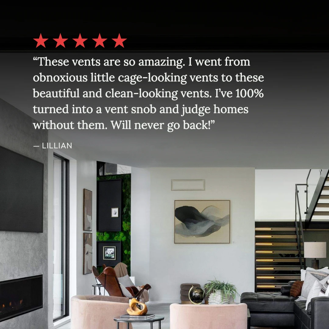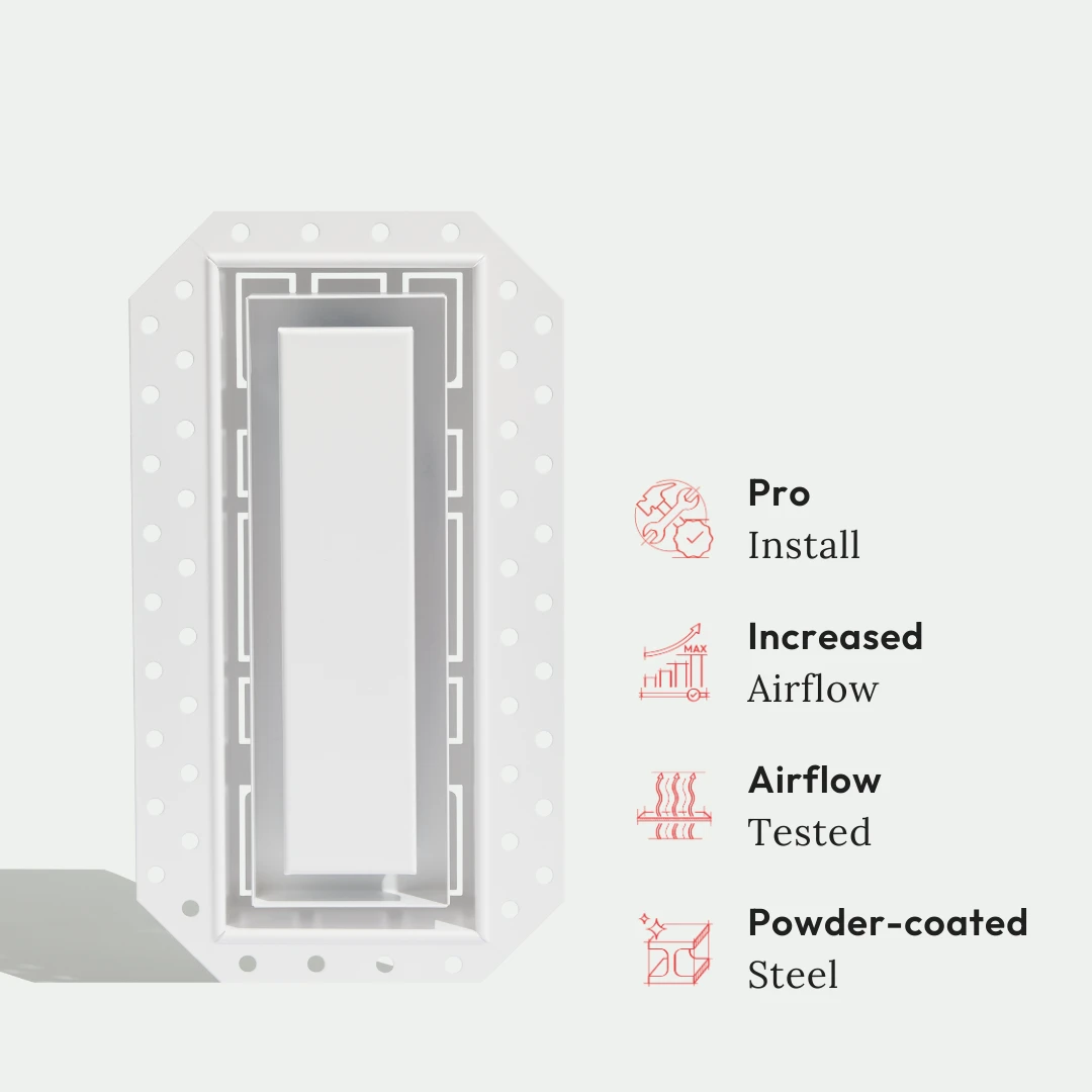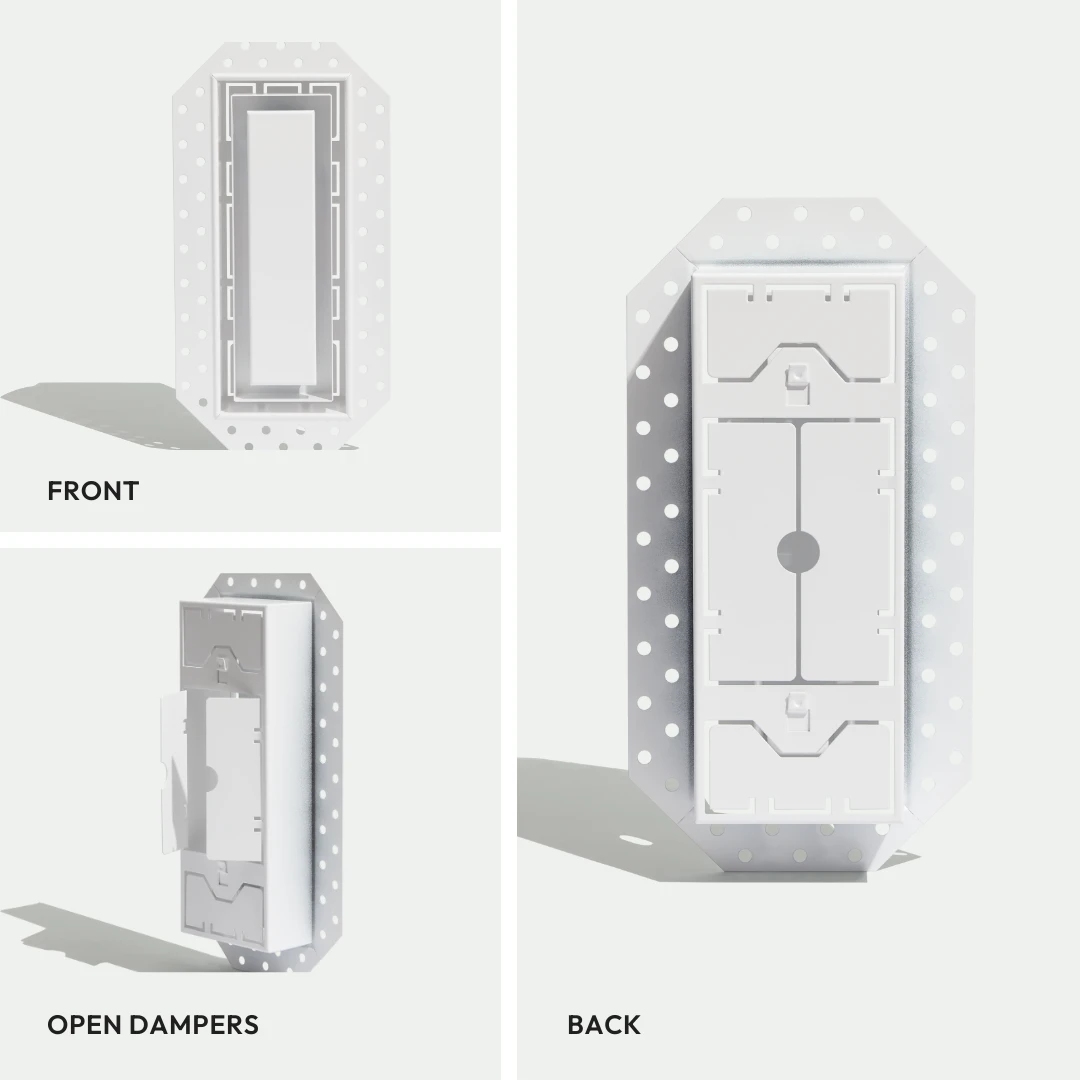 We’ve reimagined old-fashioned grill vents. An innovative, ultra-minimalist design with all the features of the Flush Wall Vent [Luxe], plus an additional channel for up to 50% increased airflow. Customizable center tray hides vents in plain sight — once installed, only a rectangular air channel is visible. Integrated dampers. Pro install in 30 minutes. Requires drywall mudding. HVAC-compatible.