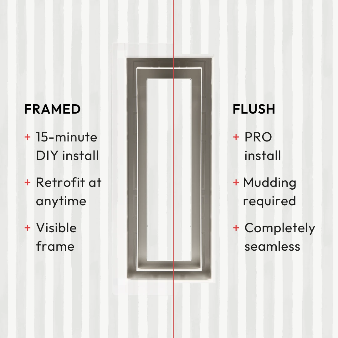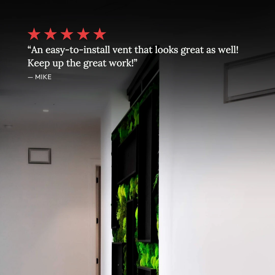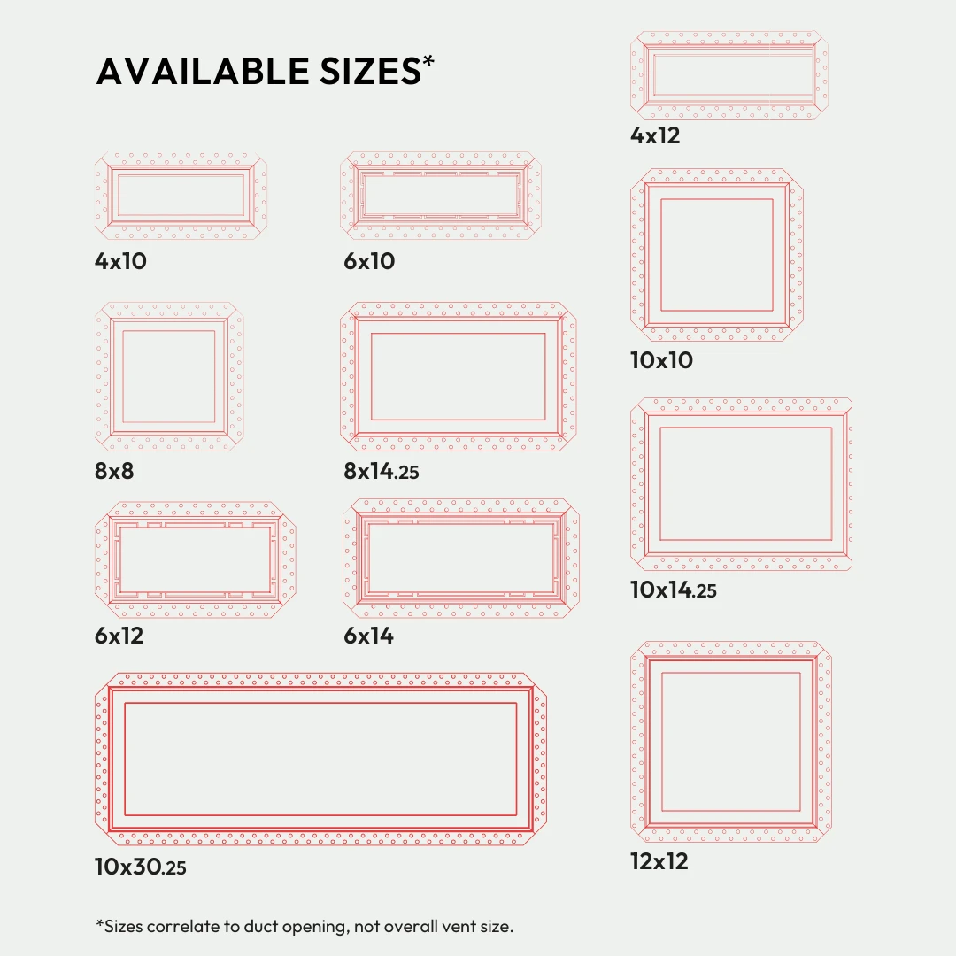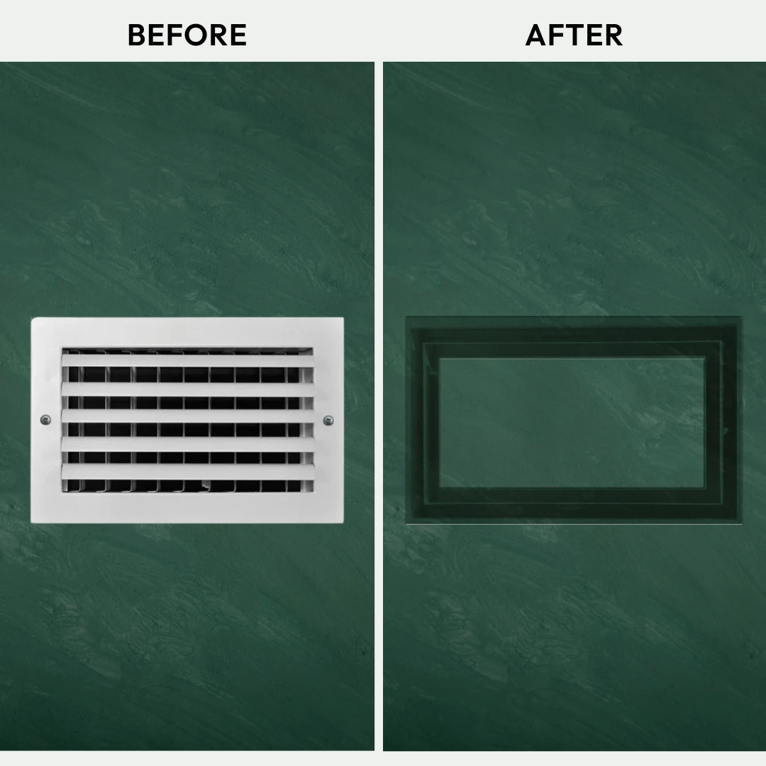 We’ve reimagined old-fashioned grill vents. An innovative, ultra-minimalist design with all the features of the Flush Wall Vent [Luxe], plus an additional channel for up to 50% increased airflow. Customizable center tray hides vents in plain sight — once installed, only a rectangular air channel is visible. Integrated dampers. Pro install in 30 minutes. Requires drywall mudding. HVAC-compatible.