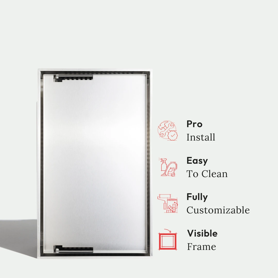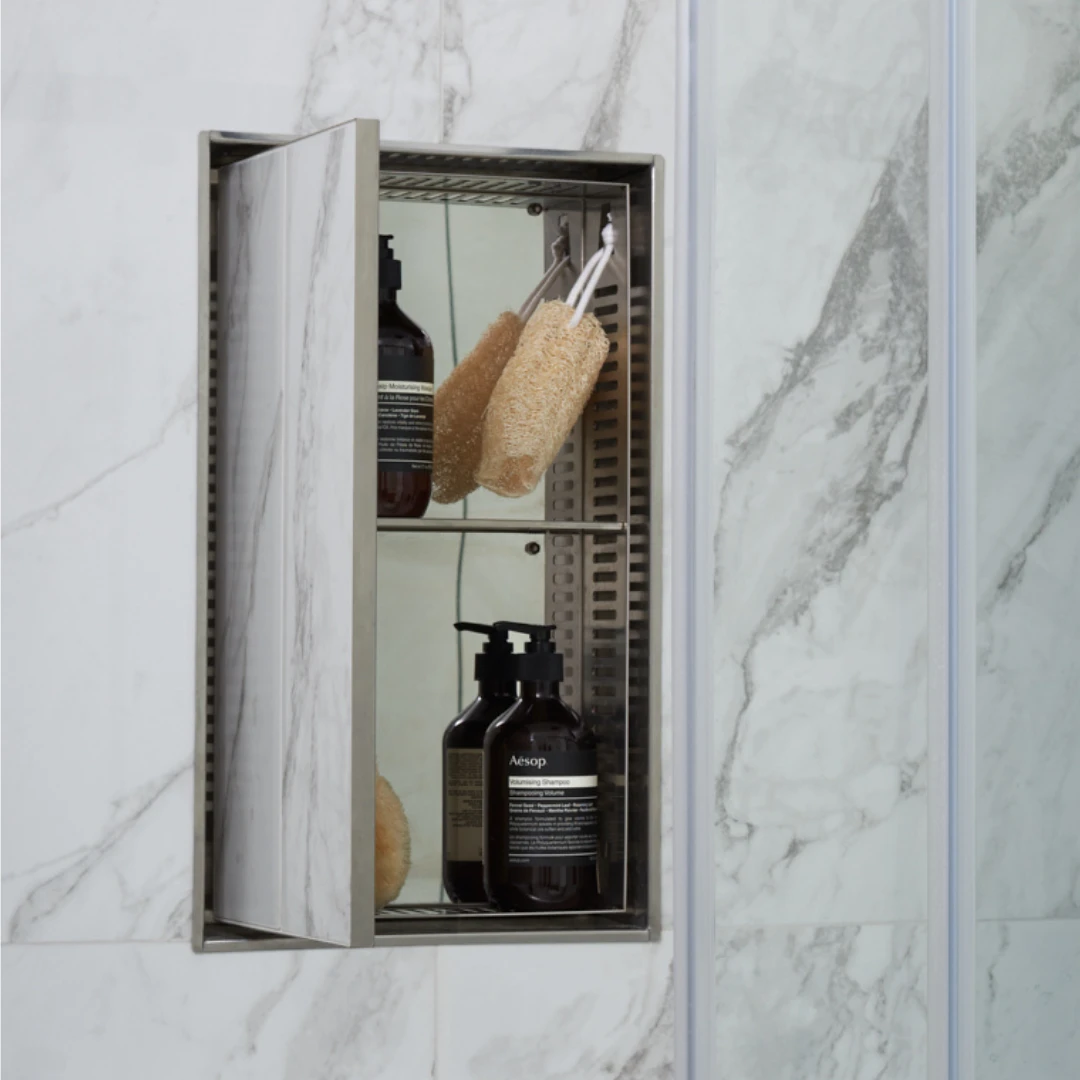 Ultra-minimalist, seamless niche to conceal shower essentials for a clean aesthetic (see what we did there?) whilst optimizing space. A recessed cubby with a customizable hinged door blends right into the shower wall — once closed, only a rectangular groove is visible. Pro install in 30 minutes. Tiling and waterproofing required.