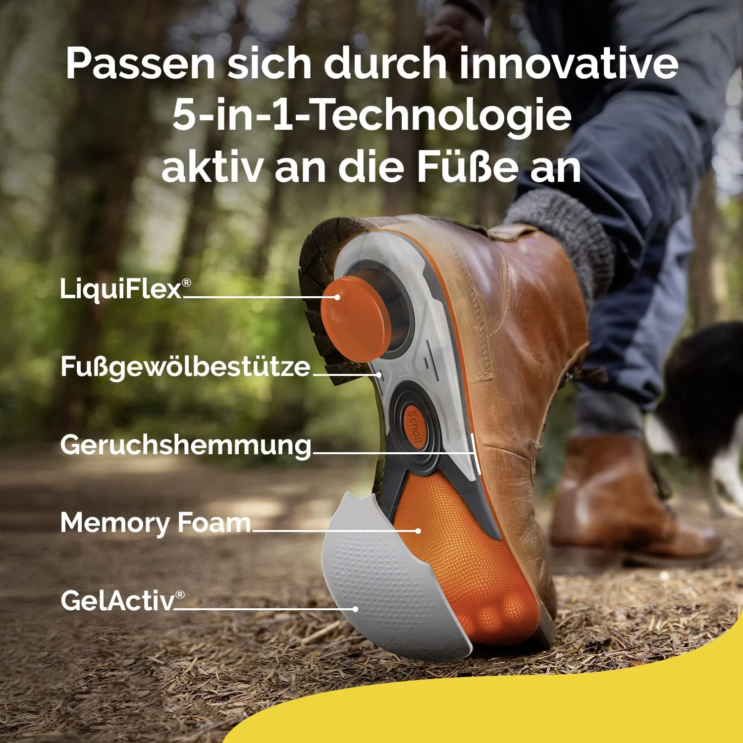 Die neuen LiquiFlex Einlegesohlen, entworfen und entwickelt gemeinsam mit führenden Podologen, bieten Ihnen den ganzen Tag über einen hervorragenden und individuellen Komfort, dank der patentierten 5-in-1 Technologie. Die Einlegesohlen passen sich durch LiquiFlex, Memory Foam und GelActiv aktiv der Form Ihrer Füsse und individuellen Bewegung an.Die neuen LiquiFlex Einlegesohlen, entworfen und entwickelt gemeinsam mit führenden Podologen, bieten Ihnen den ganzen Tag über einen hervorragenden und individuellen Komfort, dank der patentierten 5-in-1 Technologie. Die Einlegesohlen passen sich durch LiquiFlex, Memory Foam und GelActiv aktiv der Form Ihrer Füsse und individuellen Bewegung an.