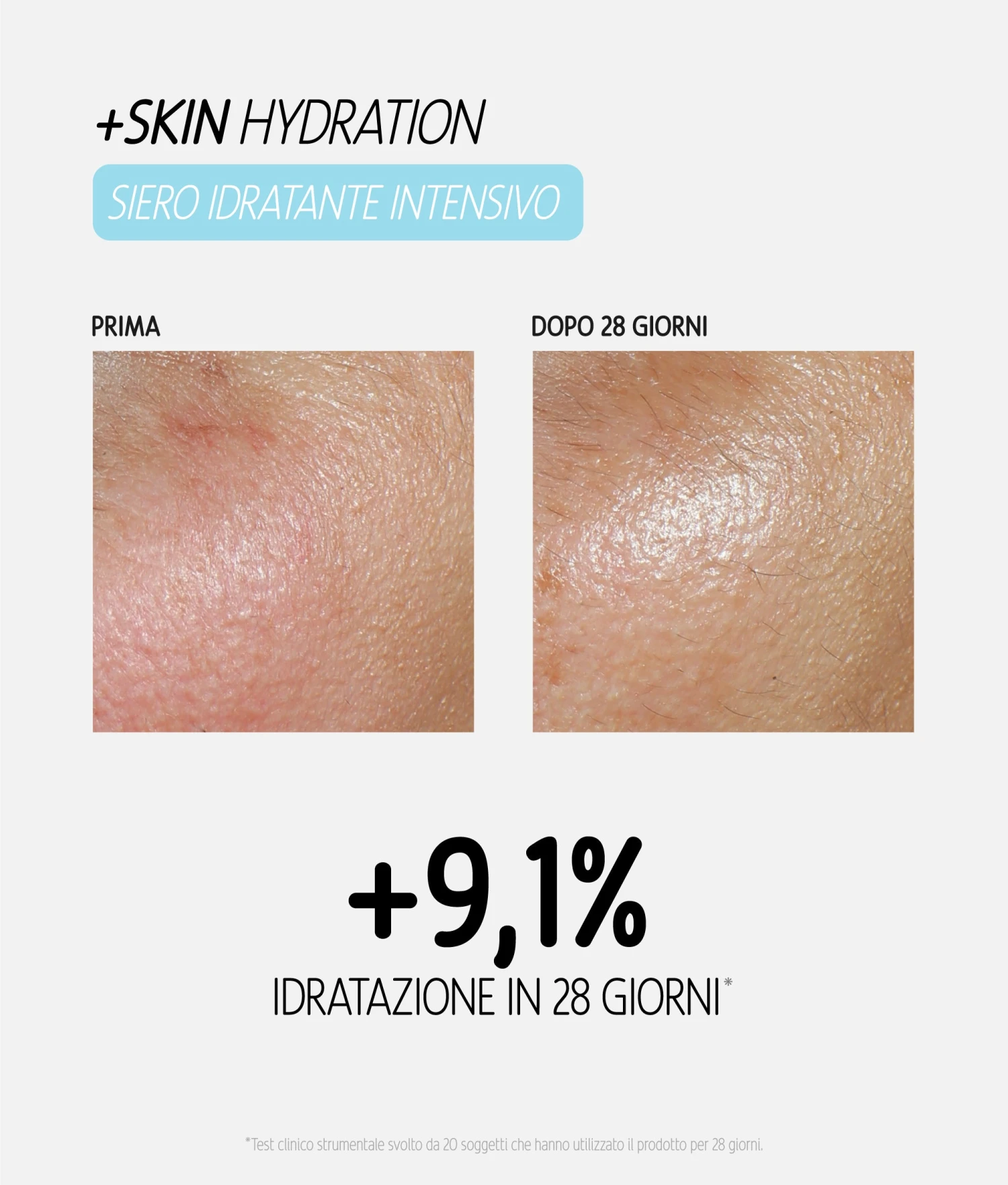 Le formule dei sieri +SKIN sono caratterizzate da texture in gel a base acqua a rapido assorbimento, prive di alcol, profumo e coloranti. Con pochissimi ingredienti e attivi in dosi funzionale. Il siero +SKIN Hydration è formulato con meno di 10 ingredienti e contiene l’1% di acido ialuronico a 3 pesi molecolari.
