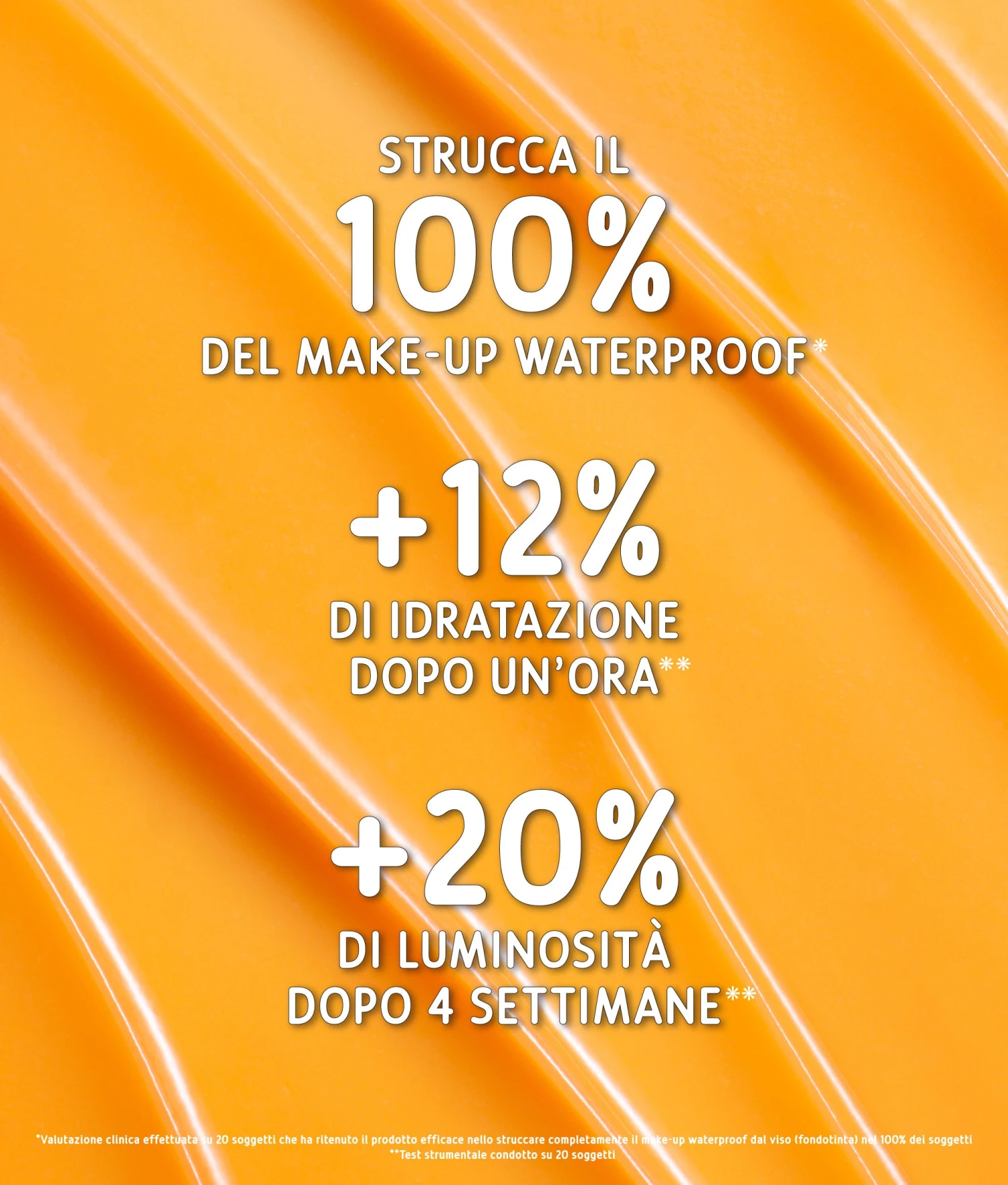 *1 Valutazione clinica effettuata su 20 soggetti che ha ritenuto il prodotto efficace nello struccare completamente il make-up waterproof dal viso (fondotinta) nel 100% dei soggetti